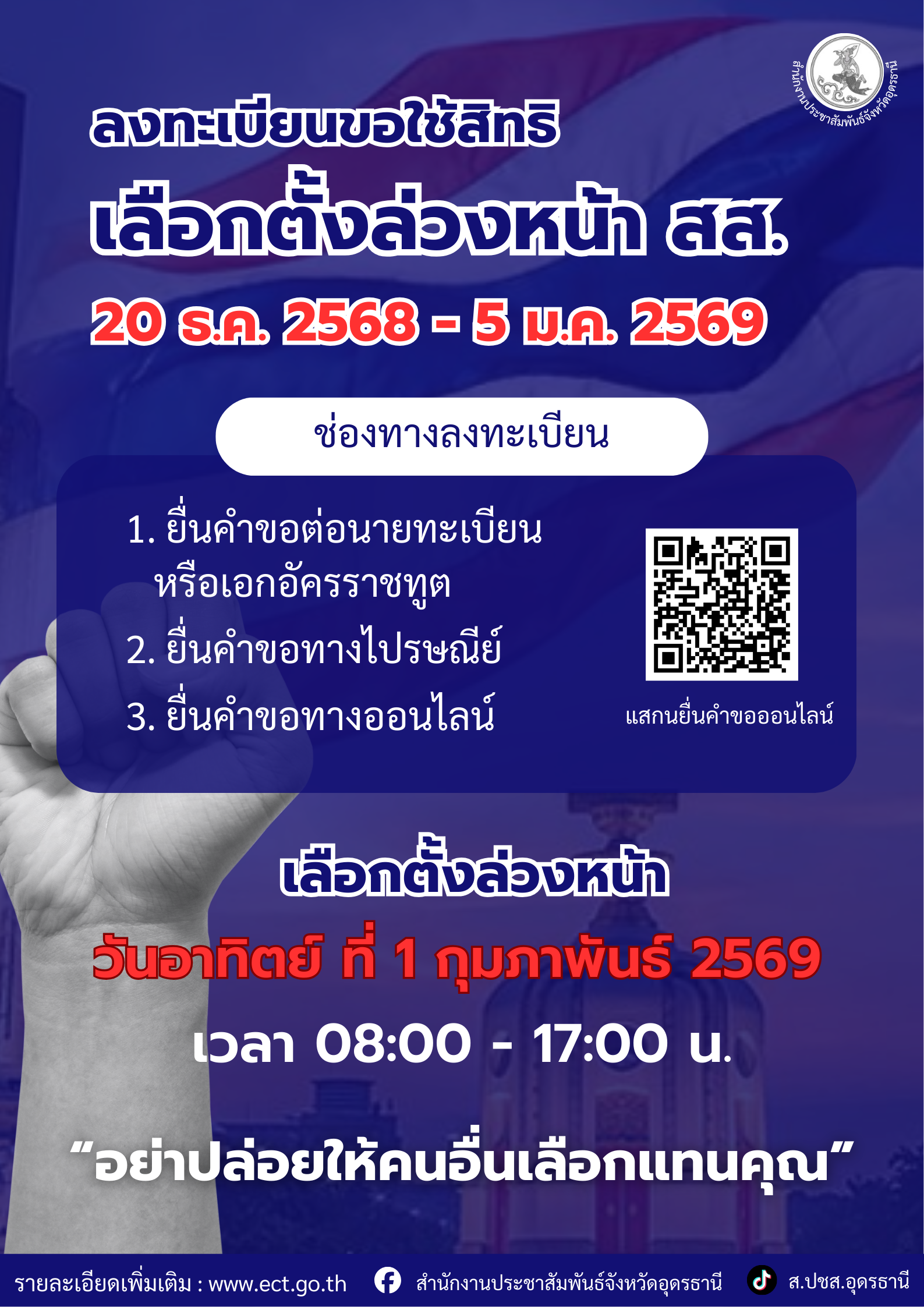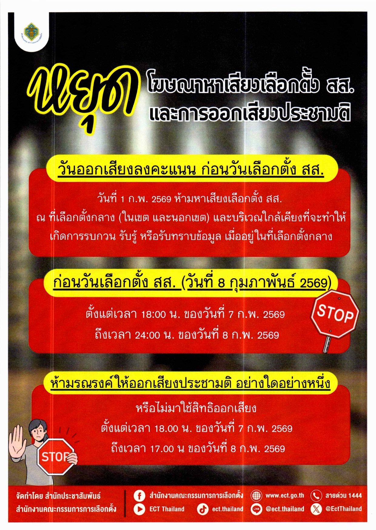 ประชาสัมพันธ์แนวทางการหาเสียงการเลือกตั้งสมาชิกสภาผู้แทนราษฎร และข้อห้ามในการหาเสียงเลือกตั้งสมาชิกสภาผู้แทนราษฎรเผยแพร่เมื่อ: วันพฤหัสบดี, 29 มกราคม 2569 15:11 | เขียนโดย เจ้าหน้าที่ อบต.บ้านขาว | พิมพ์ | อีเมล | ฮิต: 218 ประชาสัมพันธ์แนวทางการหาเสียงการเลือกตั้งสมาชิกสภาผู้แทนราษฎร และข้อห้ามในการหาเสียงเลือกตั้งสมาชิกสภาผู้แทนราษฎร สำหรับวันออกเสียงลงคะแนนก่อนวันเลือกตั้ง ในวันที่ 1 กุมภาพันธ์ 2569 และสำหรับวันเลือกตั้งทั่วไป ในวันที่ 8 กุมภาพันธ์ 2569 ในรูปแบบของรูปภาพอินโฟกราฟฟิก (Infographic) ก่อนหน้า ต่อไป